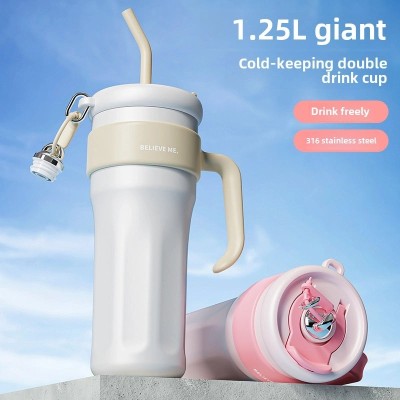 Trendy Large 1250ml Vacuum Straw Bottle for Women | Fashionable Stainless Steel Cold Drink Container | Drinkware