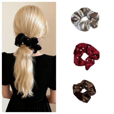 Women Girls Winter Pearl Velvet Low Bun Hair Bands Solid Color