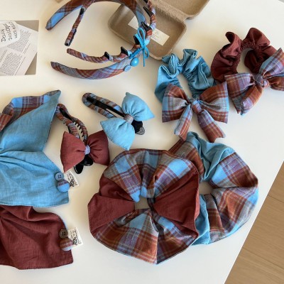 Women Girls Cloth Scarf Ponytail Hair Tie Blue Red Plaid Lattice