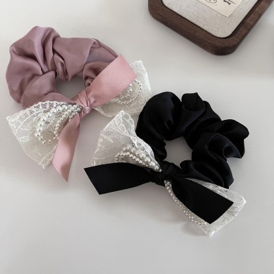 Women's Elegant Lace Pearl Ponytail Elastic Hair Tie Bowknot Pink Black