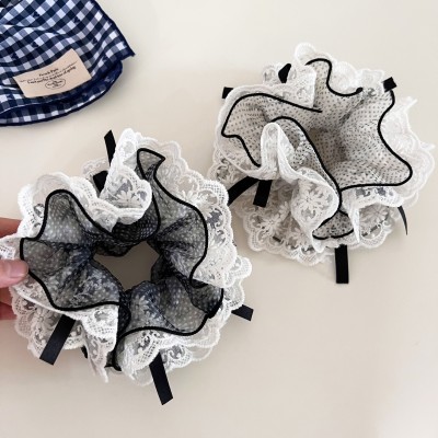 Women's French Lace Bow Elastic Hair Tie For Buns Black White Polka Dot