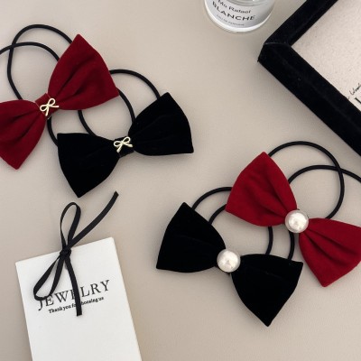 Women's Elegant Velvet Bowknot Hair Tie Pearl Ponytail Holder Black