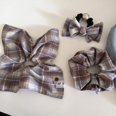 Women Cloth Bow Hair Scrunchies Coffee Plaid Checkered Autumn Winter