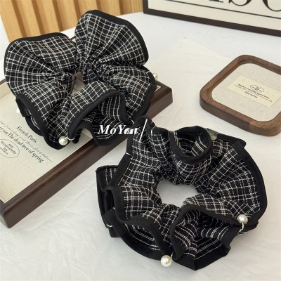 Women's Trendy Black & White Plaid Scrunchie with Pearl Bow Knot