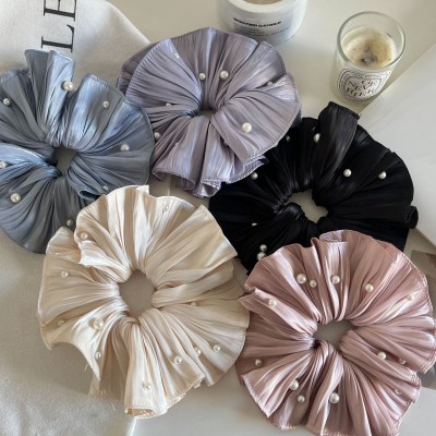 Women Elegant Satin Hair Tie Vintage Pearl Crystal Edge Pleated Scrunchie