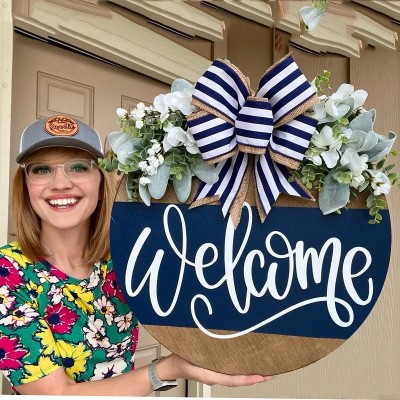 Year-Round Wooden Letter Wreath with Green Bow and Aquatic Plants | Home Decor & Door Hangings