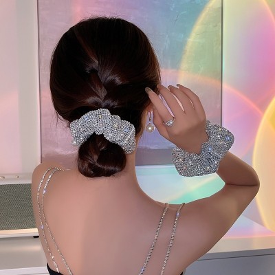Women's French Satin Rhinestone Starry Scrunchie Hair Tie Solid Color