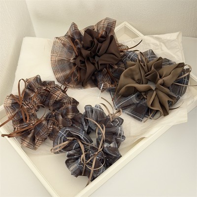 Women's Preppy Organza Bowknot Scrunchie Coffee Plaid Hair Tie