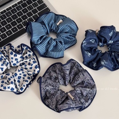 Women's French Style Cloth Spring Hair Tie Navy Blue Floral Plaid