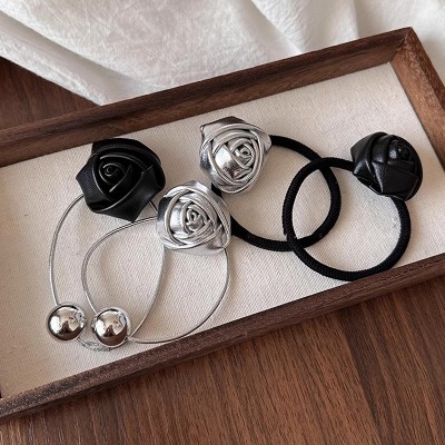 Women Durable Cloth Hair Bun Tie All Seasons Rose Flower Black Silver