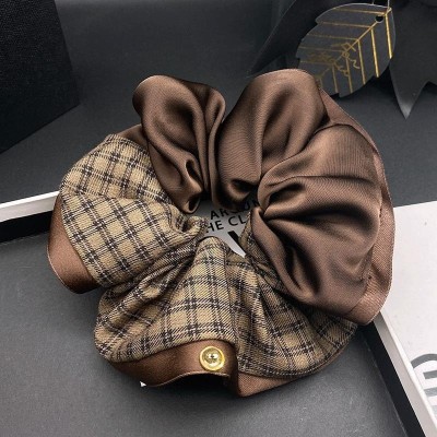 Women's Elegant Plaid Satin Hair Tie, Grey & Black Patchwork Winter Accessory