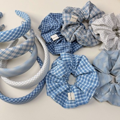 Women Sweet Cloth Hair Band Spring Daily Wear Blue Plaid Pattern