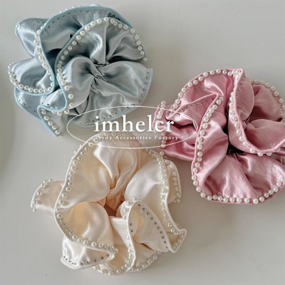 Women's French Satin Pearl Beaded Elastic Scrunchie Solid Color